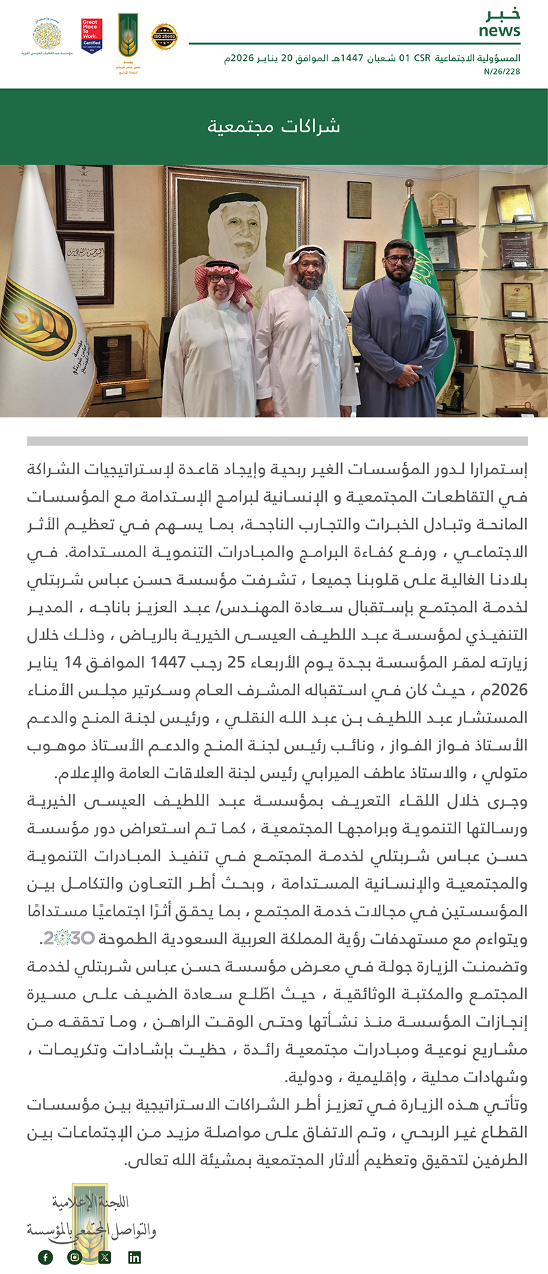 مؤسسة حسن عباس شربتلي لخدمة المجتمع تستلم تقرير انجازات شريك نجاح برنامج الاعتدال