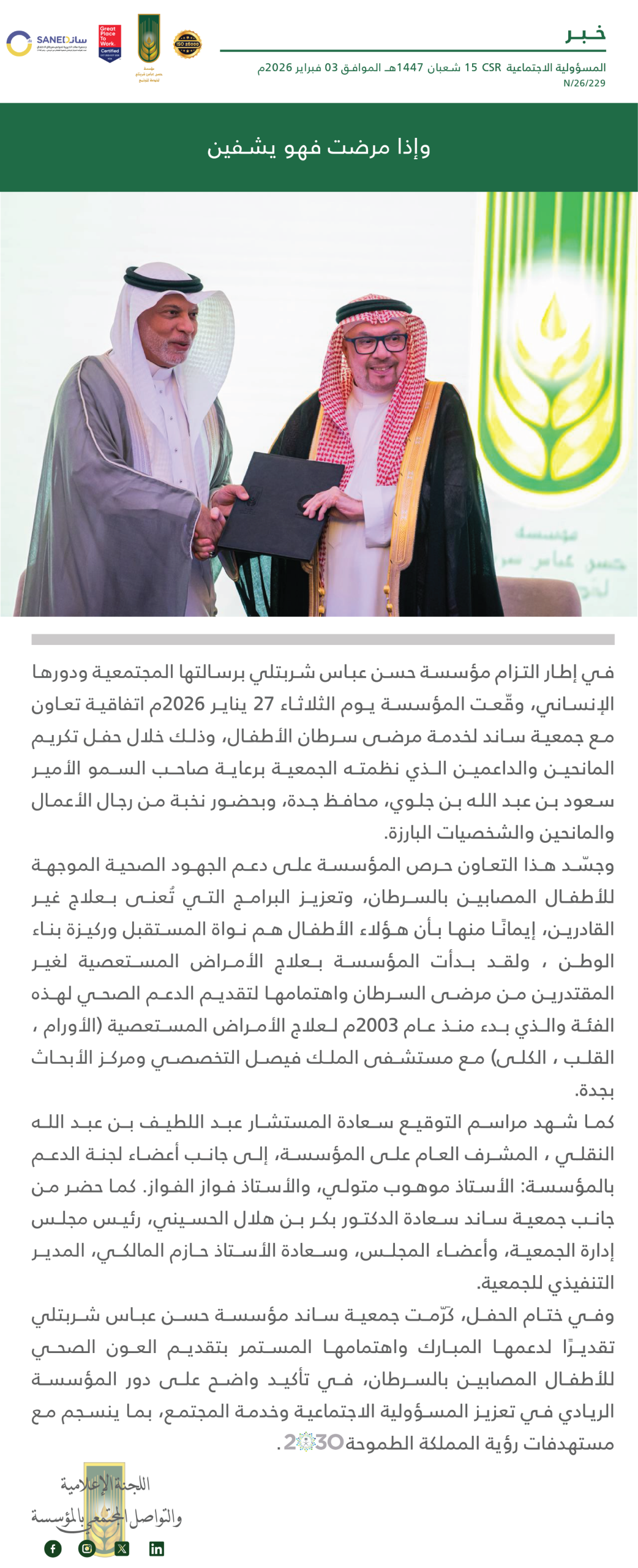 توقيع مذكرة تفاهم بين مؤسسة حسن عباس شربتلي لخدمة المجتمع وشركة باب خير للخدمات الطبية