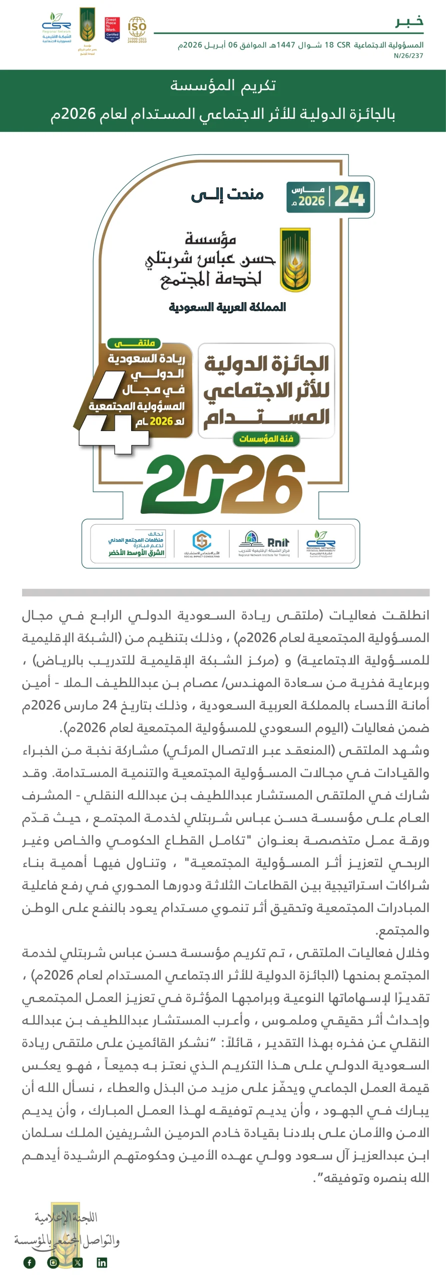 المشرف العام على المؤسسة يترأس القمة الخليجية الثانية للعمل الإنساني لعام 2025م في البحرين